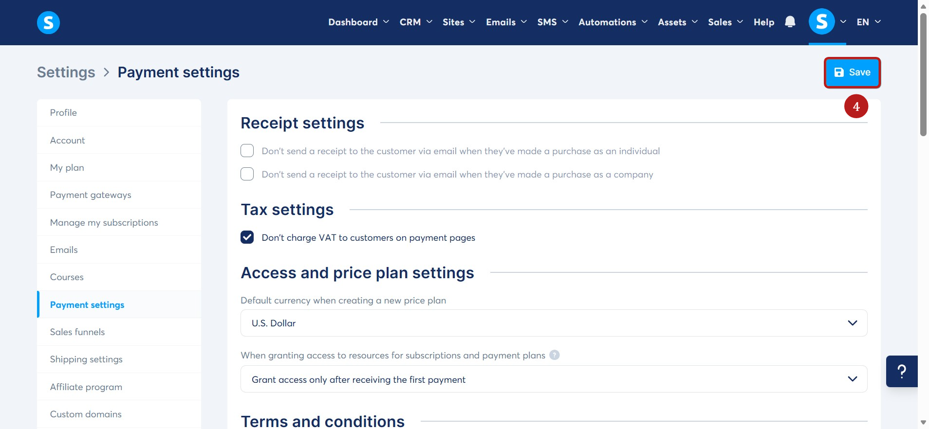 คลิก บันทึก (4) ที่ด้านบนของการตั้งค่าหน้าการชำระเงินเพื่อบันทึกการเปลี่ยนแปลง